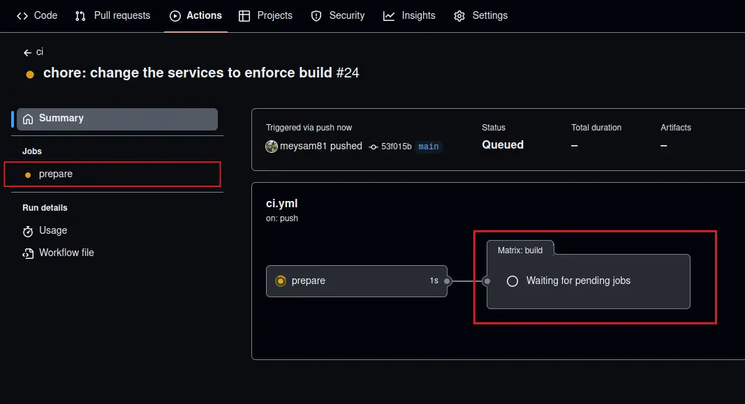 Lastly, the matrix passed from the first job is accessed in lines 25 and 32. The key service is explicitly defined in the earlier job and is not a reserved keyword in GitHub Actions, nor a special keyword in the matrix.