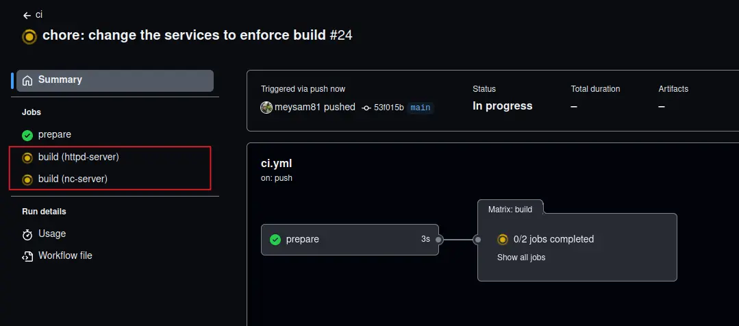 The idea is that this step will only execute if the previous step has determined that there are changes in the services. We have provided the length as a hint for this next step to ensure no unnecessary job runs, nor do we hit any error due to an empty list in the matrix input.