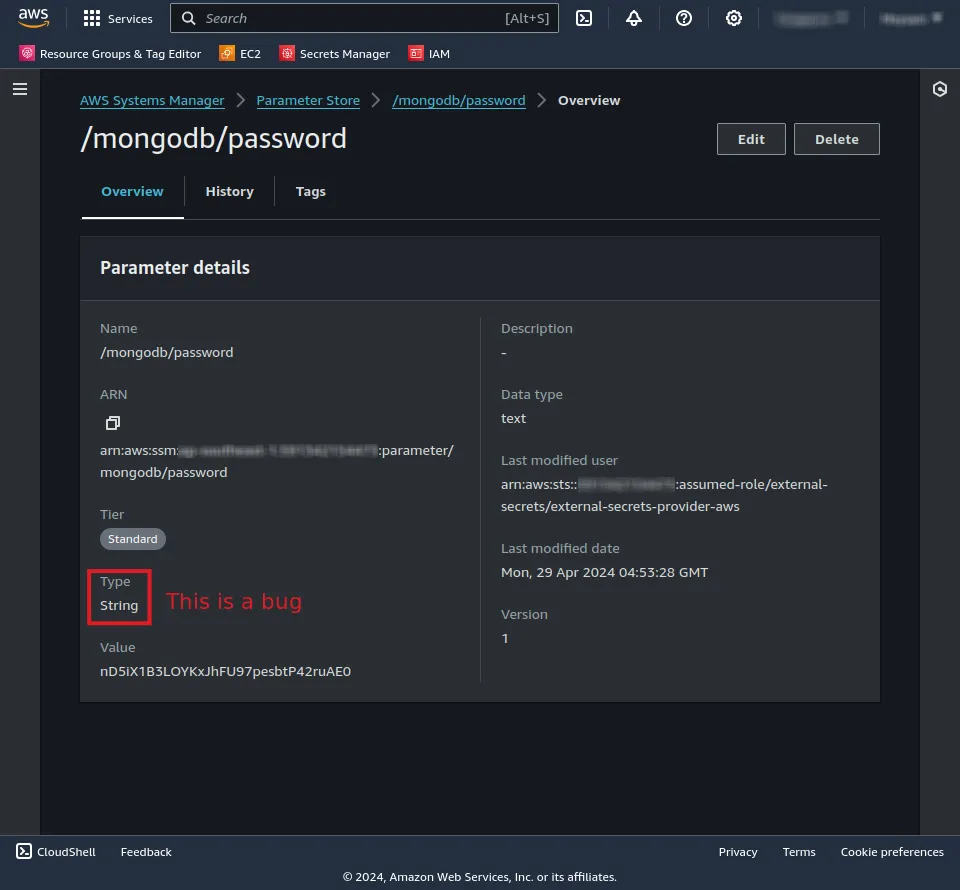 This will result in the following parameter to be created in our AWS account.
