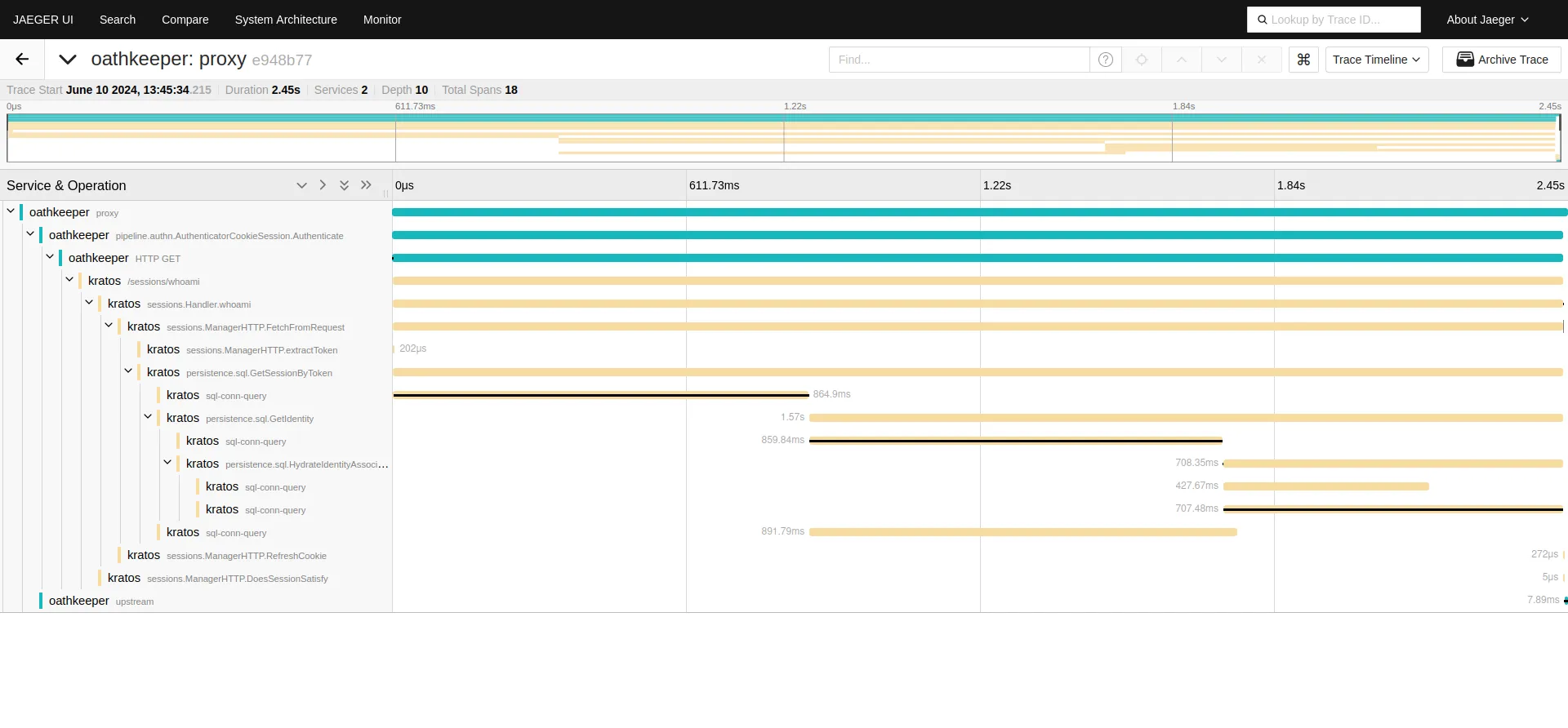 When we engage both Oathkeeper and Kratos in one HTTP request, this is what we get in the Jaeger UI.