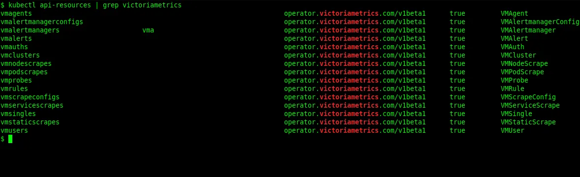 Having the Victoria Metrics Operator installed, we can query and see that we have the corresponding CRDs available in our Kubernetes cluster.